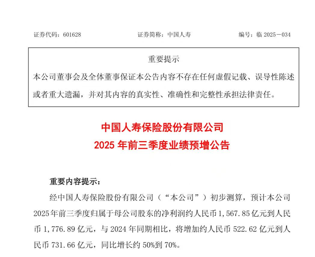 中国人寿(601628.SH)公告称,预计2025年前三季度归属于母公司股东的净利润约1567.85亿元到1776.89亿元,同比增长约50%到70%。报告期内,公司深化资负联动,推进产品和业务多元,增强可持续发展能力。投资方面坚持服务实体经济,把握股票市场回稳向好机遇,坚决加大权益投资力度,前瞻布局新质生产力相关领域,投资收益同比大幅提升。