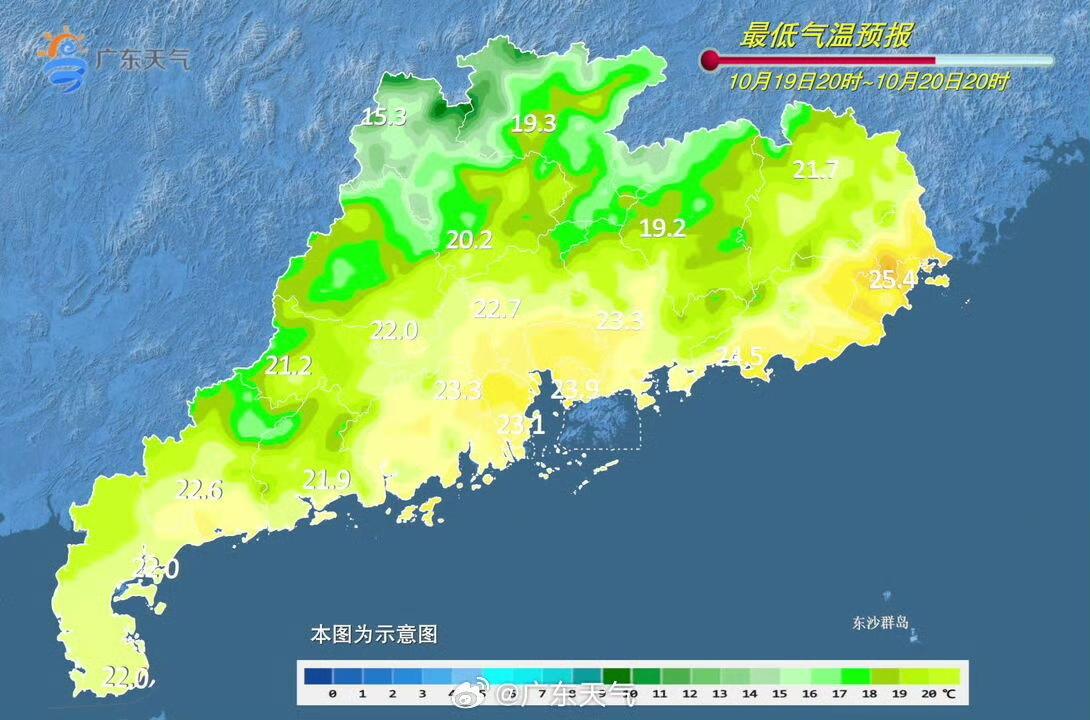 具体预报为:19日,粤北偏北市县阴天,有分散小雨,粤东市县多云转阴天有分散阵雨,其余市县多云。最高气温:清远北部和韶关北部22-27℃,粤北其余市县和珠三角北部市县28-31℃,其余大部市县31-33℃。