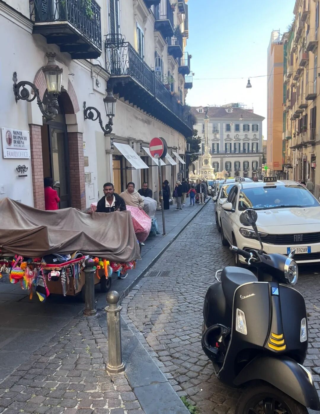 那不勒斯的石头路很难走,更不要提它还被戏称“西欧重庆”,处处是上下坡。走在队首的印度人就中招了,平板车的轮子被道路缺口卡住,在他的作用力下不得已倾斜了30度左右,才颤颤巍巍地向前行进。