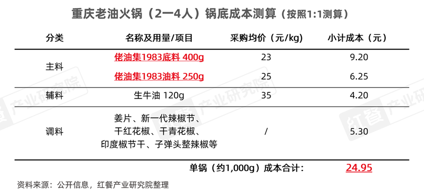 在原材料及成本方面,以2至4人份的重庆老油火锅为测算样本,制作锅底的原料除了核心原料佬油集1983底料与油料外,仅需搭配生牛油、辣椒节、花椒等常规辅料及调料即可,成本仅需24.95元,毛利率平均能达到60%以上。