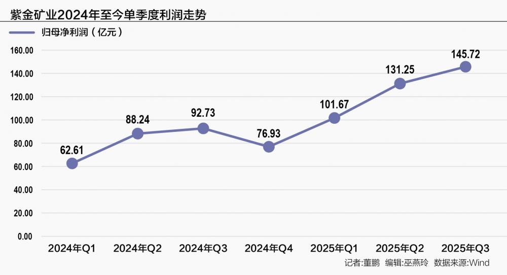 紫金矿业上周末披露的三季报显示,当期归母净利润增长55.5%至378.6亿元,其中第三季度净利润达到145.7亿元,再次刷新历史最好成绩。