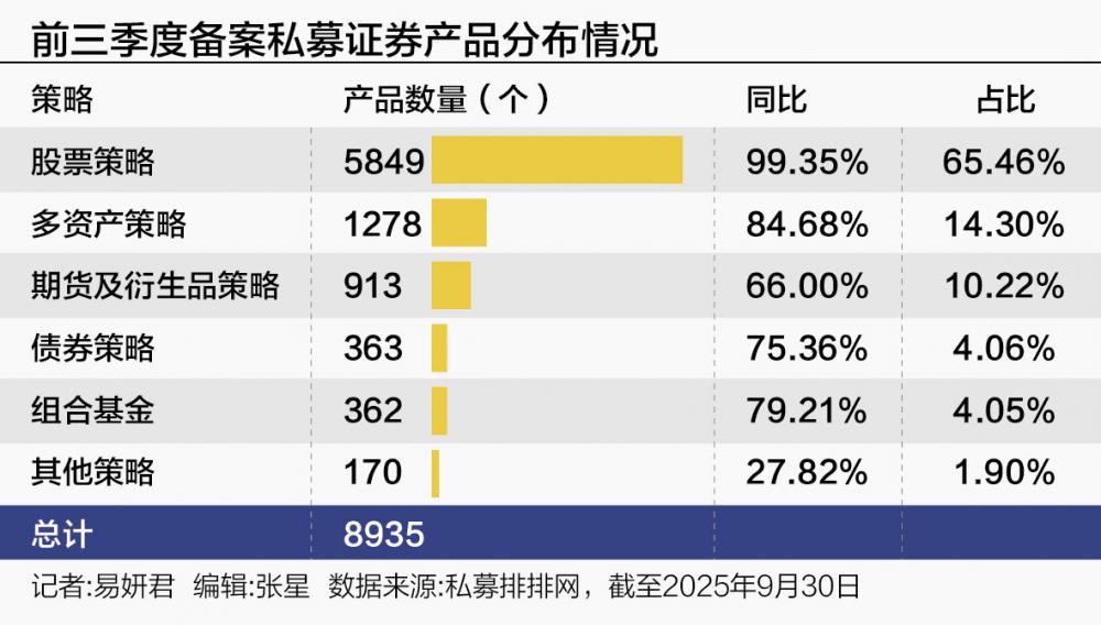 来自私募排排网的数据显示,今年前三季度,私募基金行业共备案私募证券产品8935只。