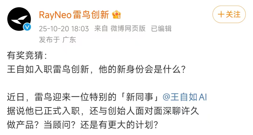 10月20日,雷鸟创新发文表示,近日,王自如已经入职雷鸟。