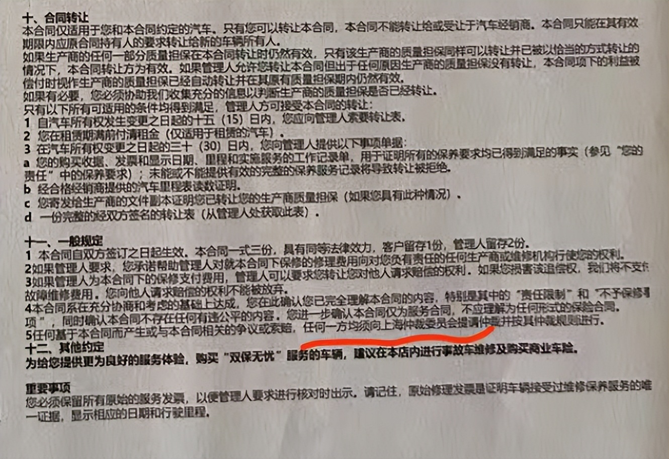 “双保无忧”合同的结尾,有一行容易被忽视的条款:“任何基于合同产生的争议或索赔,需向上海仲裁委员会提请仲裁并按照仲裁规则执行。”这意味着北京的车主需要跑到上海,用远高于去法院起诉的成本进行仲裁。