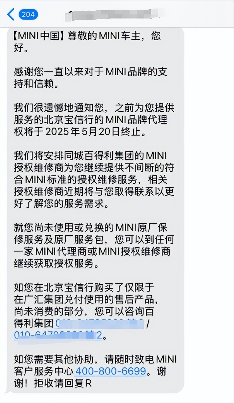 家住北京的陈颐,2024年5月在北京宝信行购买了一辆宝马mini,当时听从销售员的推荐下单了一款1.5万元的“双保无忧”的保养套餐。然而,今年5月陈颐突然收到宝马中国的短信,说宝马与北京宝信行的授权合作即将终止,所有售后服务即将转移给其他经销商。