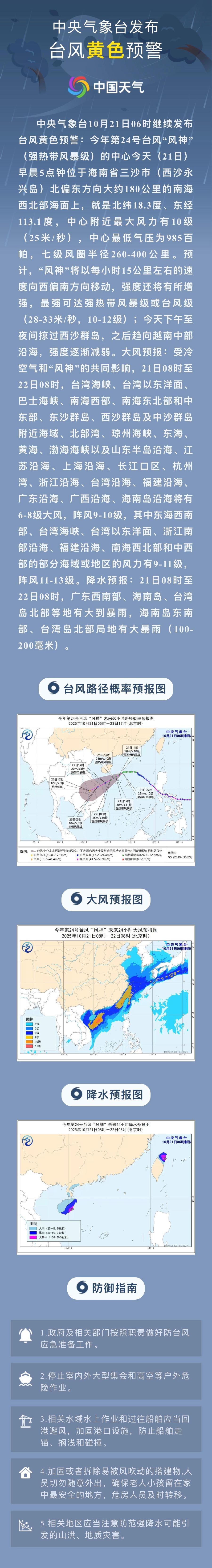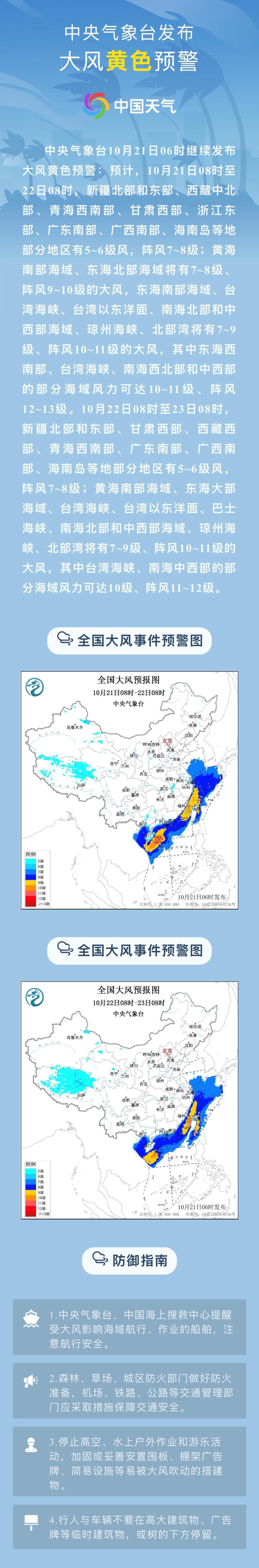 10月21日6时,中央气象台继续发布台风、大风黄色预警: