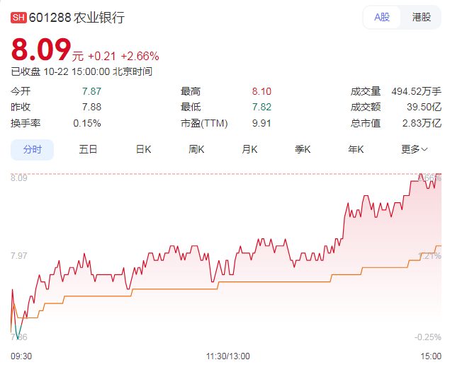 10月22日,银行股继续走强。其中,农业银行迎来令人瞩目的14连阳,总市值攀升至2.83万亿元,成功超越工商银行,跃居A股市值首位。值得一提的是,自9月25日以来,农业银行股价累计上涨23%,表现突出。