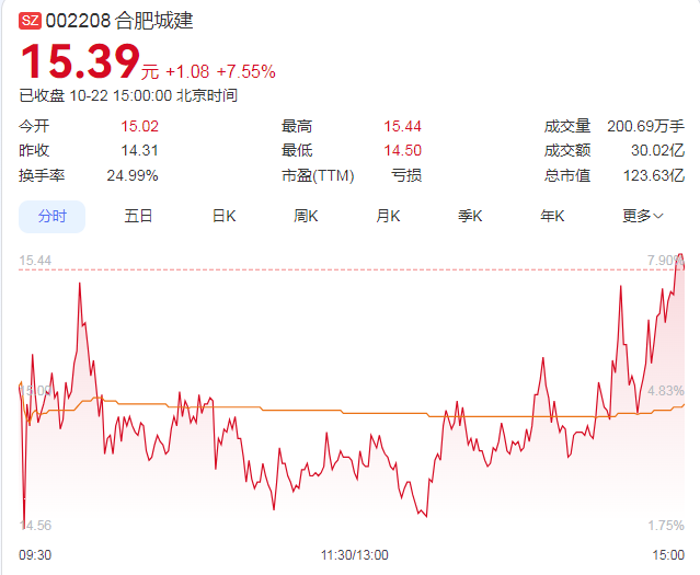 10月22日,合肥城建股价呈现强劲上涨态势,涨幅高达7.55%,报收于15.39元/股。当日成交额为30.02亿元,总市值为123.63亿元。据统计,自9月30日起,该股累计涨幅已超过101%,股价表现十分亮眼。