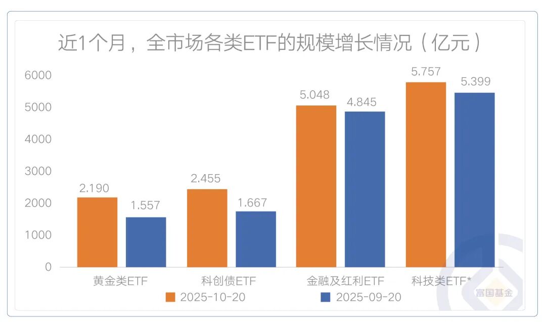 此外,金融(银行及券商)与红利类ETF继续获得资金青睐,规模在同期扩张了203.05亿元;而科技类ETF中,芯片、软件等硬科技方向也承接了超过350亿元的增量资金。