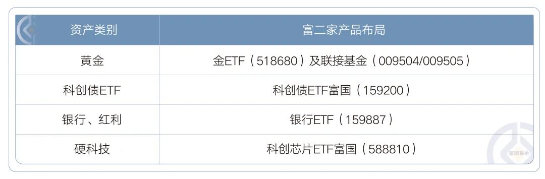风险提示:1)以上内容不代表对市场和行业走势的预判,也不构成投资动作和投资建议,且可能根据市场情况而发生调整。请投资者关注指数基金的投资风险,指数基金主要投资于标的指数成份股及备选成份股,具有与标的指数相似的风险收益特征,业绩表现将会随着标的指数的波动而波动;同时相关基金在多数情况下将维持较高的股票仓位,在股票市场下跌的过程中,可能面临基金净值与标的指数同步下跌的风险。2)金ETF属于黄金ETF,主要投资对象为黄金现货条约,其风险收益特征与国内黄金资产的风险收益特征相似,不同于股票型基金、混合型基金、债券型基金和货币市场基金。金ETF表现与黄金价格相关性较高,需承担金价波动带来的相关投资风险,敬请关注投资黄金主题基金的特有风险;同时金ETF为交易型开放式基金,敬请关注基金份额二级市场交易价格折溢价、基金份额赎回对价的变现、投资者申购或赎回失败等交易型开放式基金的特定风险。上海金ETF联接基金的目标ETF为富国上海金ETF,目标ETF主要投资对象为黄金现货合约,故上海金ETF联接基金风险收益特征与目标ETF相似,即与国内黄金资产的风险收益特征相似,不同于股票型基金、混合型基金、债券型基金和货币市场基金。敬请关注投资黄金主题基金的特有风险。请投资者详细阅读产品法律文件,根据自身风险承受能力审慎决策。经富国基金评定,金ETF及其联接基金的风险等级为R4中高风险,科创债ETF富国的风险等级为R2中低风险,银行ETF、科创芯片ETF富国的风险等级为R4中高风险,适合风险承受能力为C4及以上的投资者。