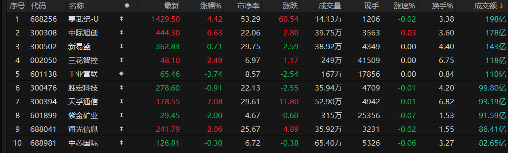 个股方面,寒武纪-U成交额198亿元居首,中际旭创、新易盛、三花智控、工业富联成交额靠前。