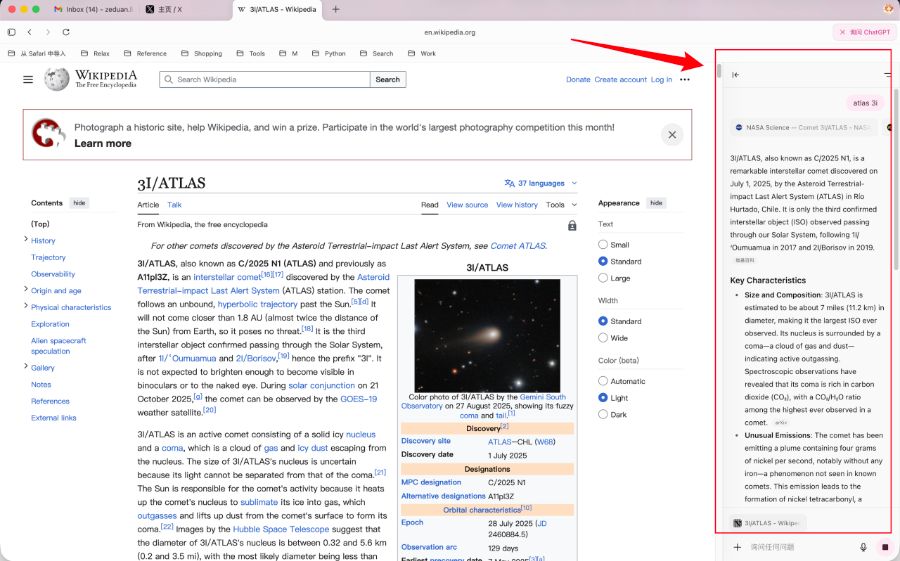 官方介绍,ChatGPT Atlas 主要有3个AI功能: