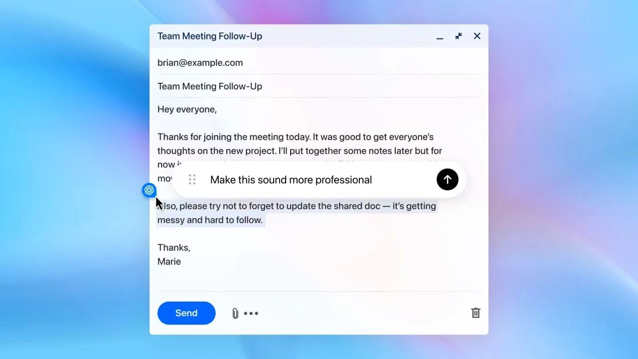 ·“光标聊天”(Cursor Chat)功能。在使用ChatGPT Atlas写邮件、发文档时,选中文字即可触发AI建议,会弹出一个 OpenAI 的 logo,点击后可以让它执行润色、缩写等操作。
