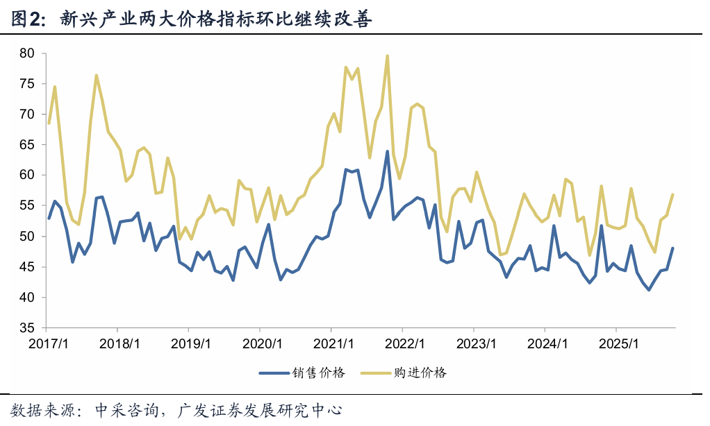 细分行业看,新一代信息技术、新能源汽车、生物产业景气领先。(1)10月新能源汽车、生物产业、新一代信息技术景气环比分别上行14.9、12.2和8.9个点,上行幅度领先且均连续3个月环比改善,“两新”政策红利、新能源车购置税抵免窗口期[1]、AI产品密集发布[2]等因素或是相关行业景气改善的主要线索;(2)出口是另一重要宏观因子,10月生物产业、新一代信息技术、新能源汽车出口订单环比上行幅度均超过10个点,其中生物产业出口订单更是回升至70以上;(3)新能源景气10月环比上行6.6个点,可能与价格端的积极变化有关,行业销售价格指标环比大幅上行11.4个点,与三季度电气机械产能利用率环比上行1.4个点对应,反映了“反内卷”的积极影响;(4)节能环保景气环比微降,绝对景气在7大细分行业中偏低。