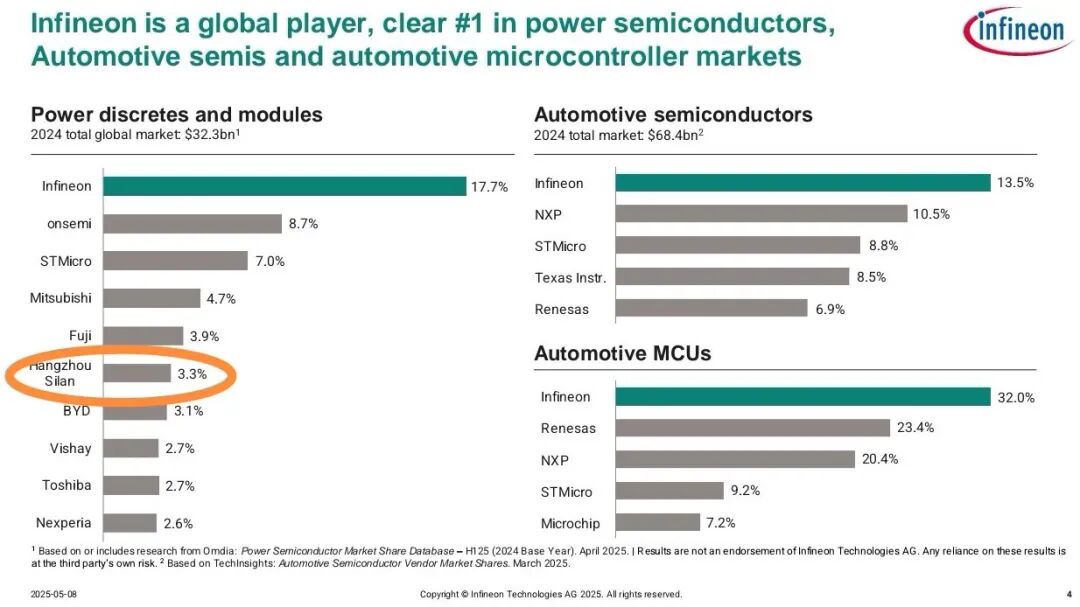 经过28年的苦心经营,英飞凌财报显示,2024年全球功率半导体市场,士兰微以3.3%的市占率,跃升至全球第六。