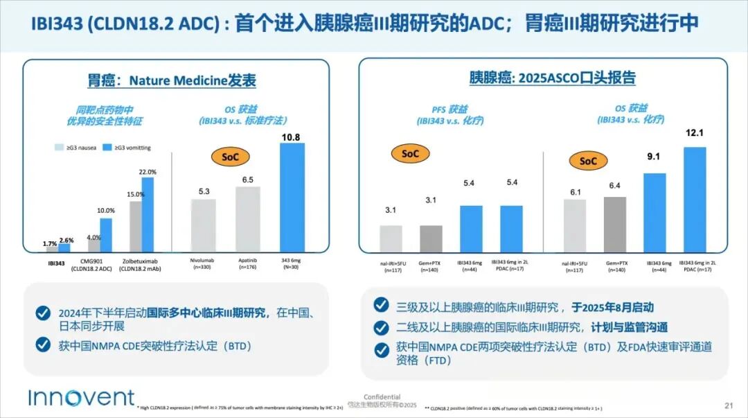 IBI343则为抗体偶联药物(ADC),对晚期胃癌、胃食管交界处腺癌,以及胰腺导管腺癌,展现出显著疗效。