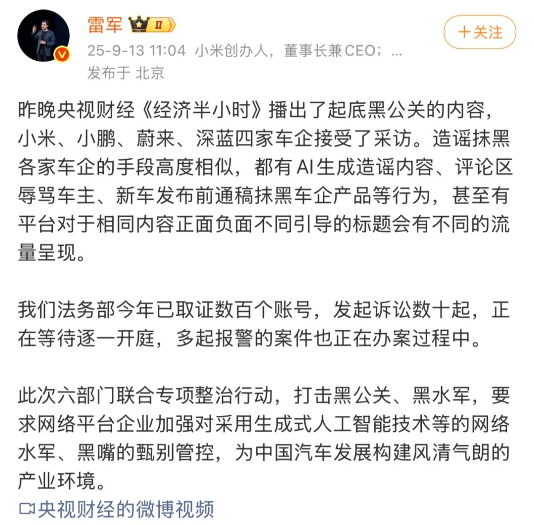 实际上,小米和雷军的反黑公关倡议并非毫无行业基础。9月12日,央视财经就曾播出专题报道,揭露新能源汽车行业黑公关产业链的运作模式:策划方下单后,内容工厂通过AI批量生成虚假信息,再经账号矩阵分发扩散,而 “小米汽车碰撞后车门打不开” 的虚假视频,早在2024年11月就已被警方查处,却仍在网络上反复传播。