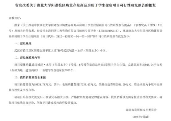 在省属高校中,湖北大学的举措也备受关注。该校于今年2月计划投资超1.9亿元,购买武汉城建·水岸(阳逻水乡)5、6号楼的350余套商品房,改造后可新增2800个床位,资金来源为中央预算内投资及学校自筹。