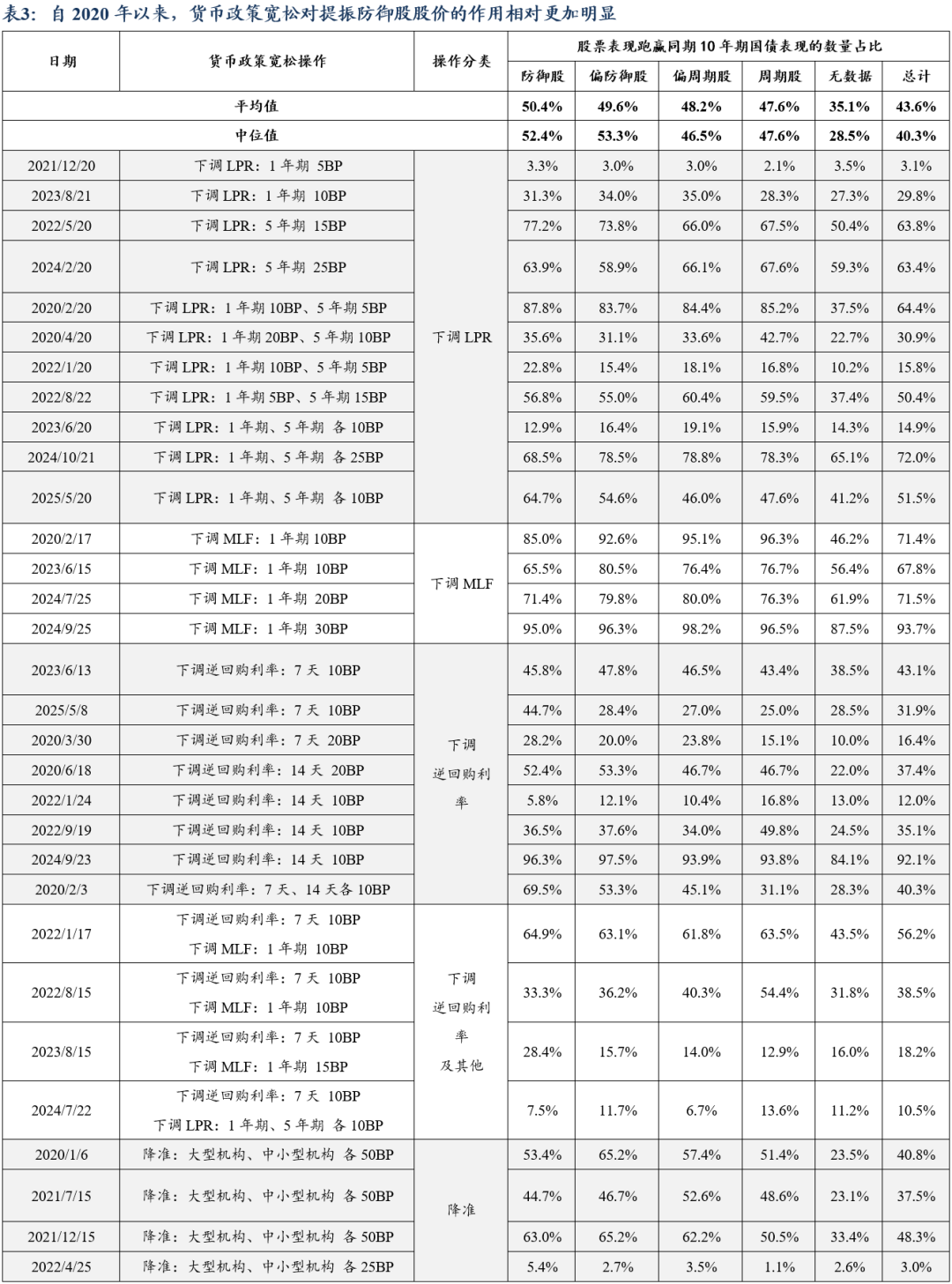 自2020年1月至2025年9月,在17次降准降息带来同期债市“走熊”时,有13次发生了超过半数防御股股价表现超过同期10年期国债收益表现的情形,但在2020年4月20日、2021年7月15日、2023年9月15日、2025年5月15日四个时点,超过50%的防御股收益表现反而不及债券。究其原因,上述时点均曾出现权益市场对产业基本面及上市公司利润、现金流改善预期不明确,货币政策未能改变权益市场主线的情形。