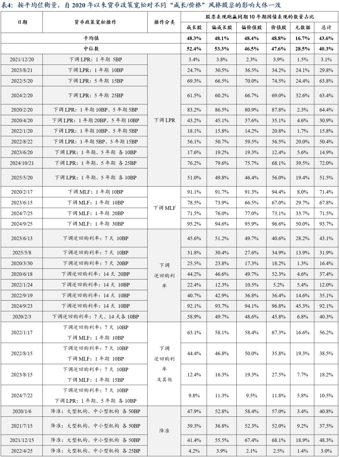 自2020年1月至2025年9月,我国央行累计开展了39次货币政策宽松操作,从不同风格的股票表现看: