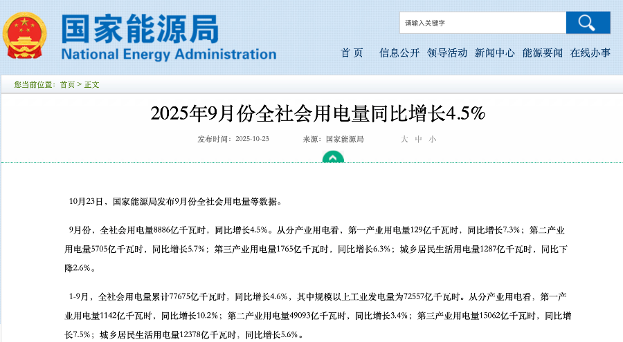 国家能源局发布9月份全社会用电量等数据(图源:国家能源局官网)
