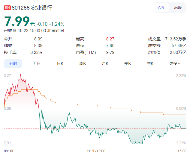 10月23日,农业银行股价盘中一度涨幅超2%,并继续创出历史新高,随后却出现跳水。截至收盘,农业银行报7.99元/股,下跌1.24%,日K线收阴,终结了此前连续14日的阳线走势。值得注意的是,今年以来,农业银行涨幅已接近50%。