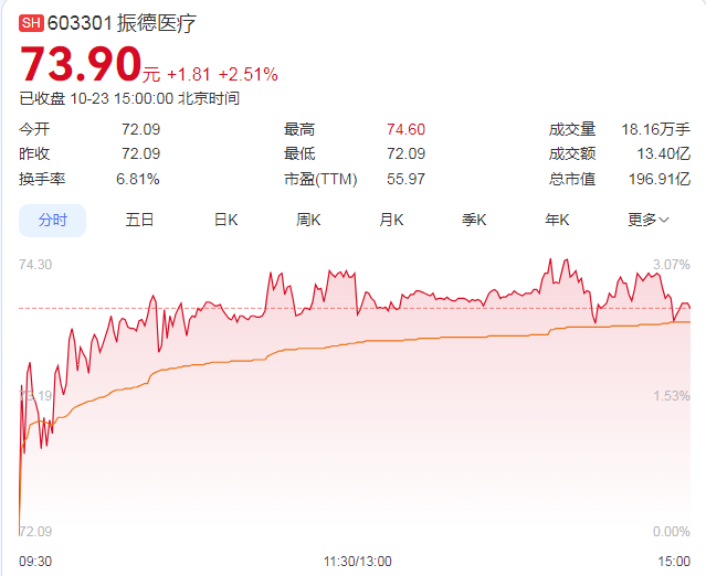 10月23日,振德医疗股价上涨2.51%,报收于73.90元/股。当日成交额为13.40亿元,总市值为196.91亿元。据统计数据显示,自9月2日起的32个交易日内,振德医疗累计涨幅已超过204%,股价表现十分突出。
