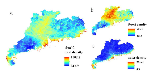 研究得出的广东省鸟类密度估计值(a:总密度,b:林鸟密度,c:水鸟密度)。