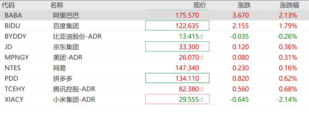 中概股延续近期涨势,纳斯达克中国金龙指数涨近0.9%,富时中国A50期货涨超0.3%,但个股表现有所分化,科技龙头涨跌不一,阿里巴巴涨超2%,百度、京东、美团拼多多等飘红,小米集团跌超2%。