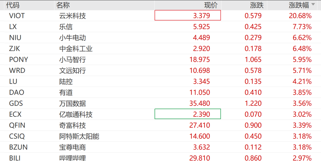 其他热门中概股方面,云米科技狂飙超20%,乐信涨超7%,小牛电动涨超6%,文远知行、小马智行涨超5%,宝尊电商、哔哩哔哩等多股涨超3%,理想汽车跌1.48%。