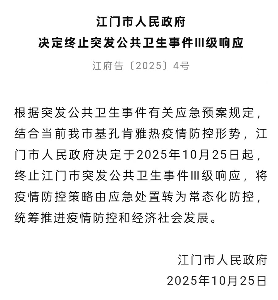 今日上午,据“江门发布”,广东省江门市人民政府决定终止突发公共卫生事件Ⅲ级响应。