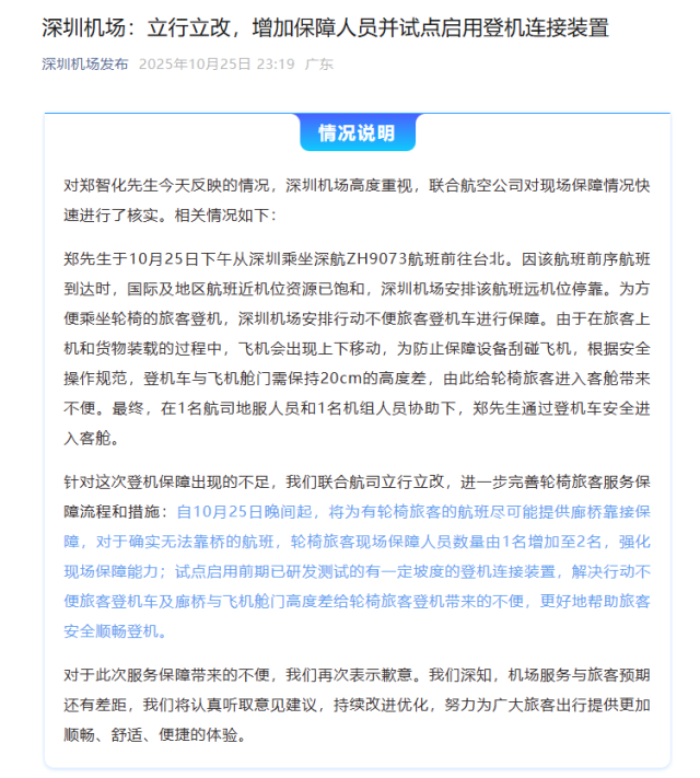 对此,深圳机场于当日23时19分通过“深圳机场发布”微信公众号发布《情况说明》。通报称,郑智化当日乘坐深圳航空ZH9073航班从深圳前往台北,因前序国际及地区航班密集,近机位资源饱和,航班被安排在远机位停靠。机场已按流程调派行动不便旅客专用登机车。但由于飞机在旅客登机及货物装载过程中存在上下浮动,为防止设备刮碰飞机,依据安全操作规范,登机车与舱门需保持约20厘米高度差,导致轮椅无法直接对接舱门。最终,在1名地服人员与1名机组人员协助下,郑先生安全登机。