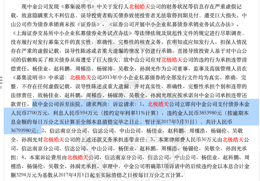 债券违约后,在债券持有人会议上,中金创新未接受北极皓天的债转股安排,选择以诉讼方式解决争议。要求北极皓天支付本金2700万元、利息594万元、违约金人民币385.40万元,共计3679.40万元,并要求中山证券以及两担保公司对该债务承担连带责任。该金额的利息和违约金仅计算至2017年3月,也就是说现在的索赔金额会更高。