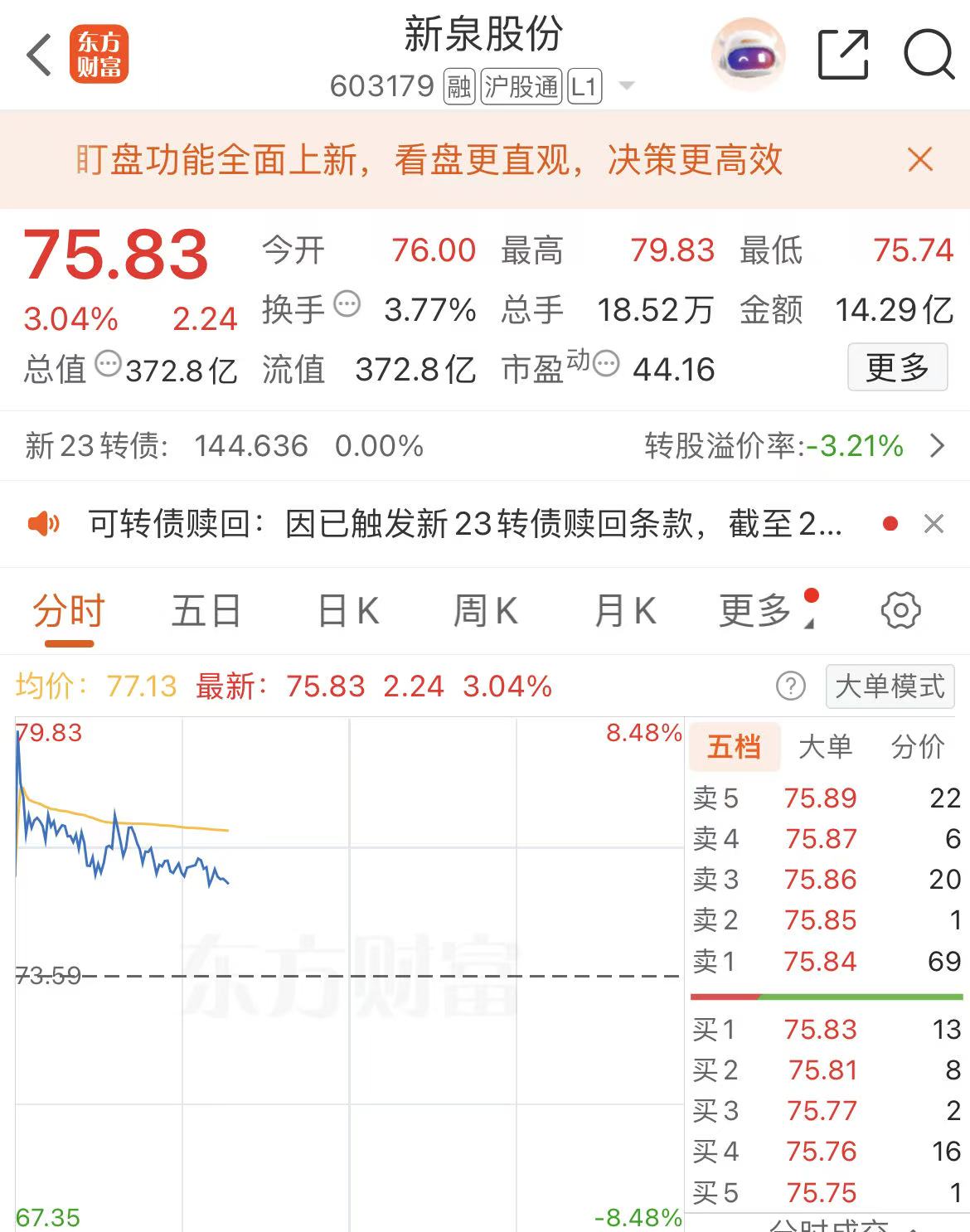 截至10月27日10:47发稿,新泉股份股价:75.83元/股,总市值为372.8亿元。