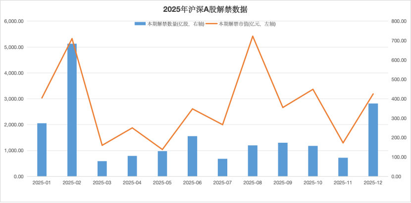 限售股解禁,意味着因多种原因锁定限售的股票可上市流通,如下图,2025年11月份上市公司的解禁数量及市值为全年较低。