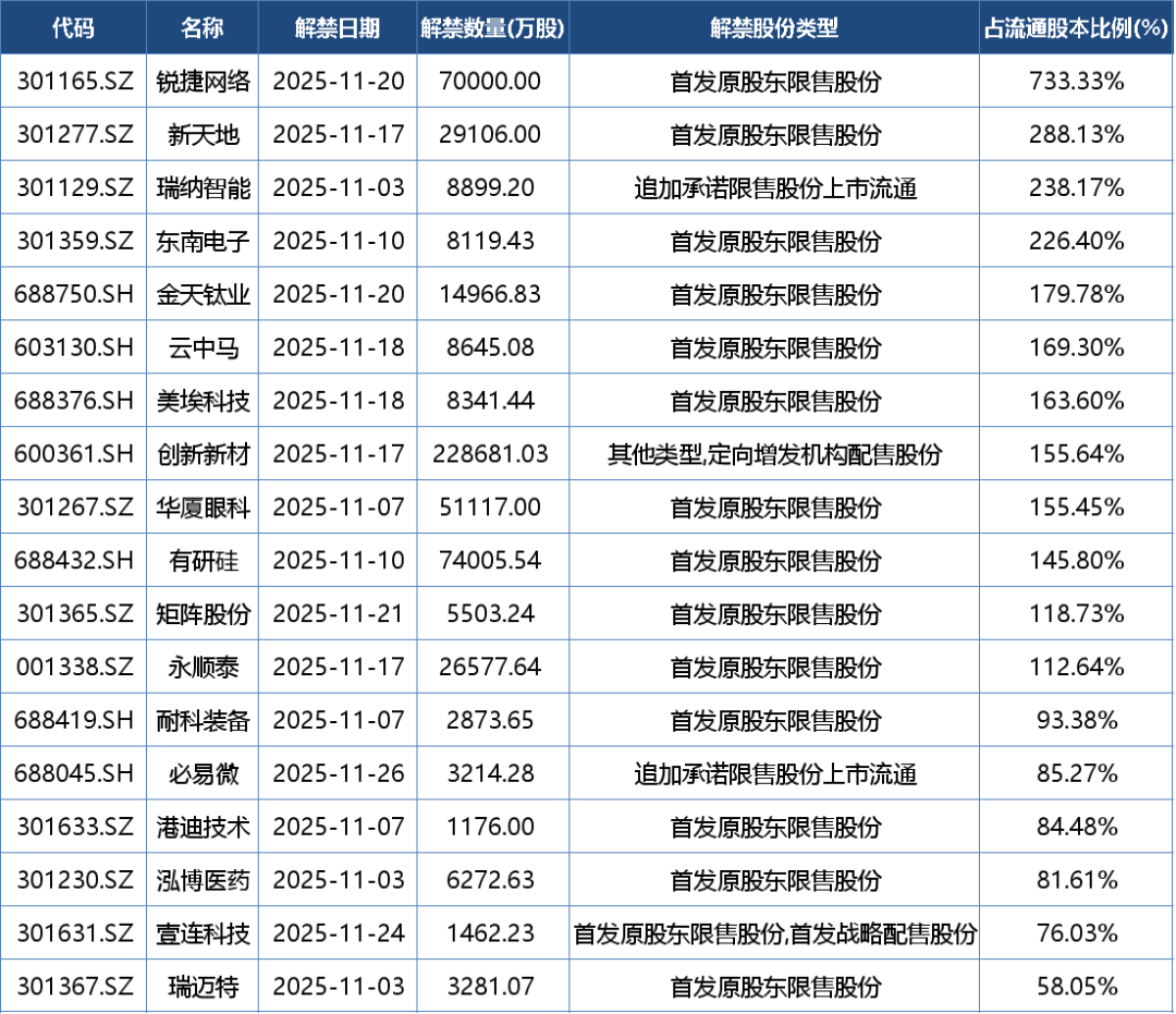2025年11月,沪深两市共有107只个股存在限售解禁,解禁股本占流通股本比例超过50%的如下: