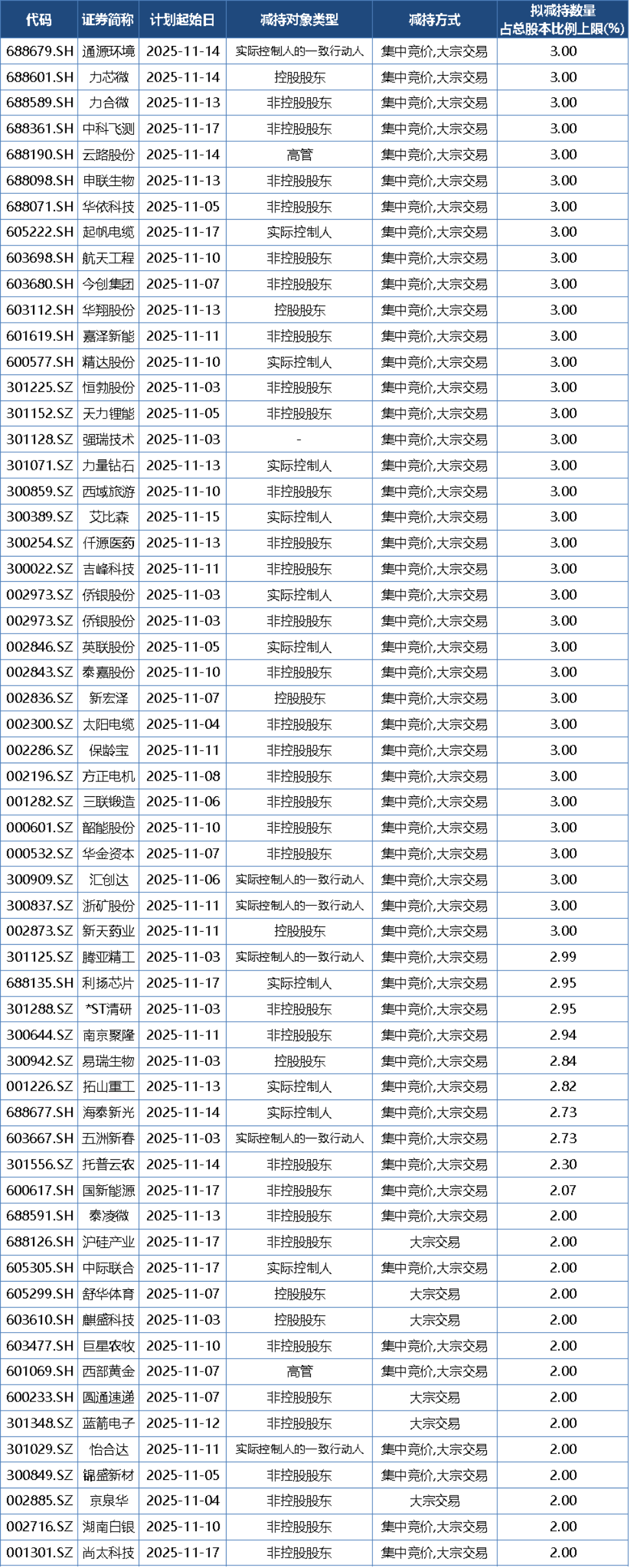 根据上市公司公告披露的减持计划,2025年11月,上市公司拟计划减持数量占总股本比例上限超过(含)2%的公司如下: