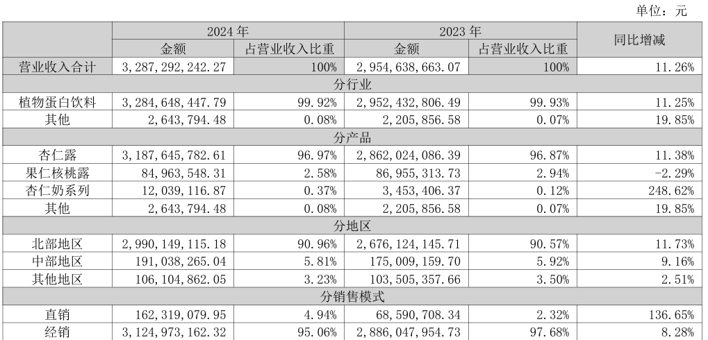 目前,承德露露的收入严重依赖于杏仁露产品。根据2024年报,承德露露杏仁露系列产品占总营业收入的比重超过90%,且九成以上收入来自北方区域,没有向全国市场铺开。