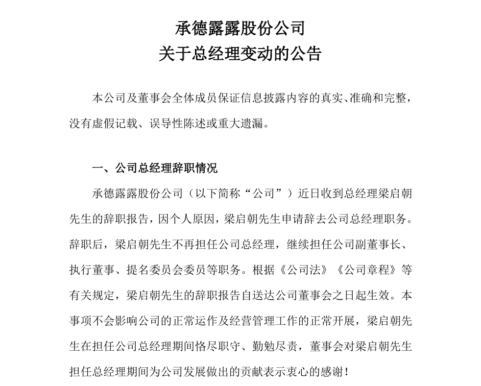 业绩压力下,承德露露频繁换帅。8月,承德露露发布公告称,公司总经理梁启朝因个人原因辞去总经理职务,辞职后继续担任公司副董事长、执行董事、提名委员会委员等职务。同日,公司召开第八届董事会2025年第一次临时会议,审议通过《关于聘任公司总经理的议案》,决定聘任丁兴贤担任公司总经理职务,并不再担任公司副总经理职务。