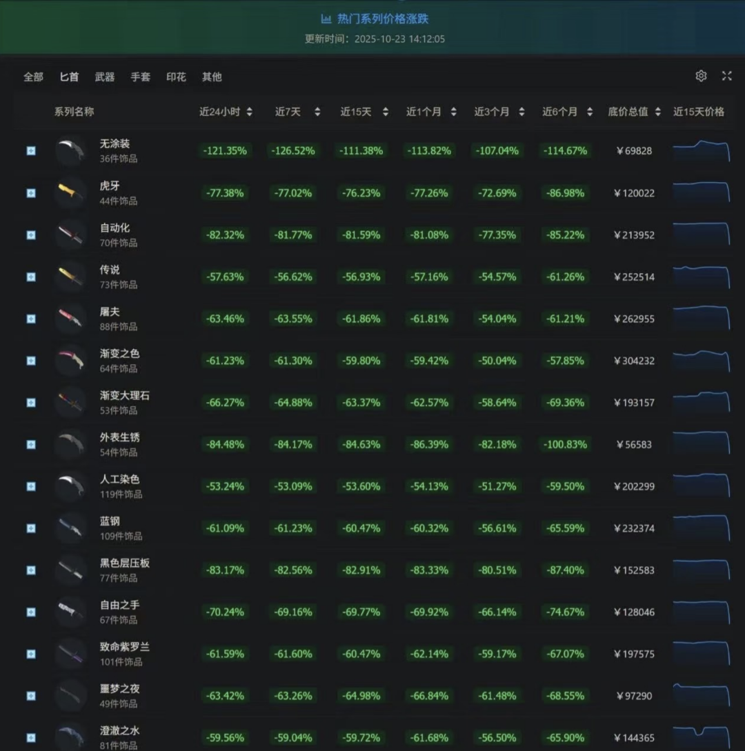 10月23日以来,两大平台数据显示,饰品市场已普遍经历一轮大幅回调,多款此前的高价装备出现大幅下跌。