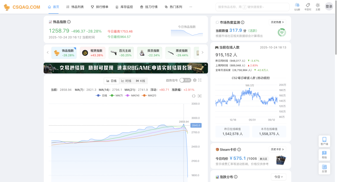 另据《CS2》饰品指数,截至发稿,该指数单日大跌28%,报收于1258.79点,较10月22日的2858.94高点近乎腰斩,饰品总市场估值一夜蒸发近20亿美元。