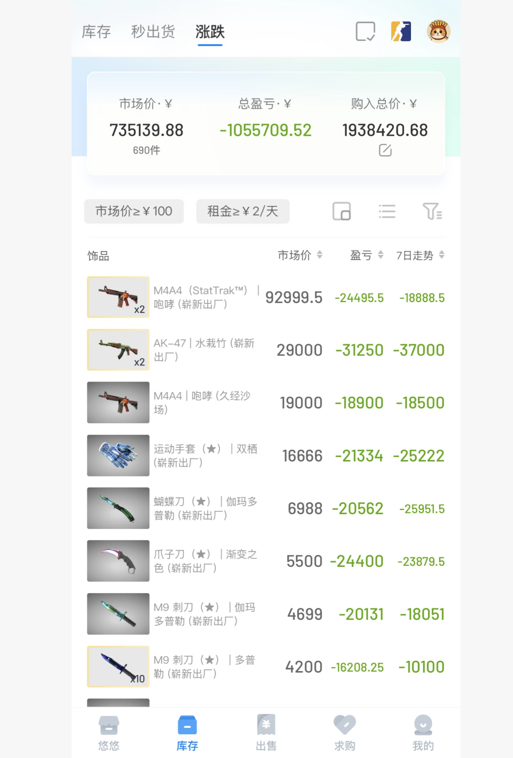 她以自身持仓举例,在此次跳水前,她持有的一把“蝴蝶刀”市场价格约为3万元,一副“摩托手套”约为1.4万元。然而仅一夜之间,前者跌至7800元,后者跌至4600元,其余装备也出现不同程度下跌,共同导致了此次大幅账面亏损。