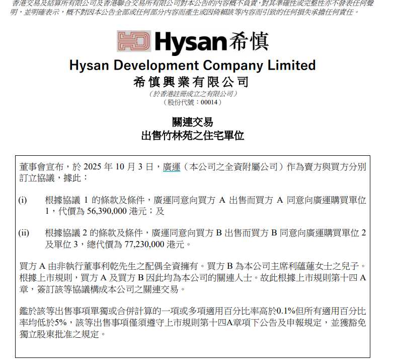 10月24日,希慎兴业(00014.HK)公告称,本公司全资附属公司广运作为卖方与买方Verdant Peak Investment Limited订立协议,出售位于竹林苑的一个住宅单位,该单位实用面积约2084平方呎(约合193平方米),代价为5354万港元。买方由独立非执行董事张勇先生全资拥有,根据上市规则,该交易构成关联交易。