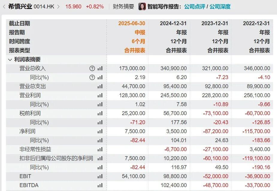 另据Wind数据,希慎兴业中期业绩显示,2025年上半年公司营业额17.3亿港元,同比增加2.19%;股东应占溢利7500万港元,同比减少82.44%。