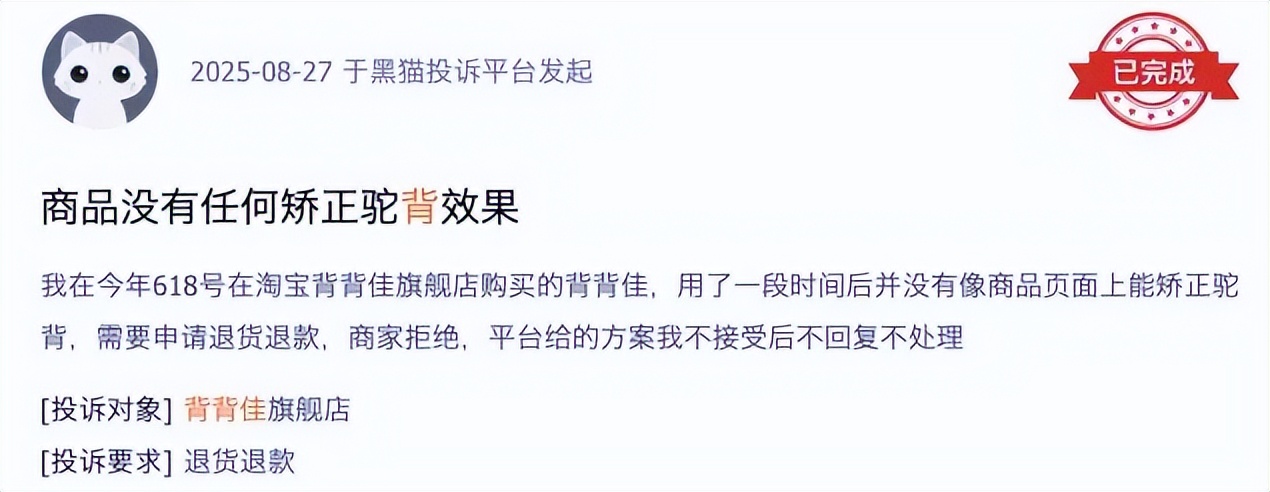 黑猫投诉平台上,多位用户反馈称,穿背背佳后“没有矫正驼背的效果”““停用后体态问题反弹”“腋下被勒得疼”“压迫肩背”。有消费者甚至表示,胸口被压得喘不过气,“后背没有支点,需要拉得很紧把背强行拉起来”。