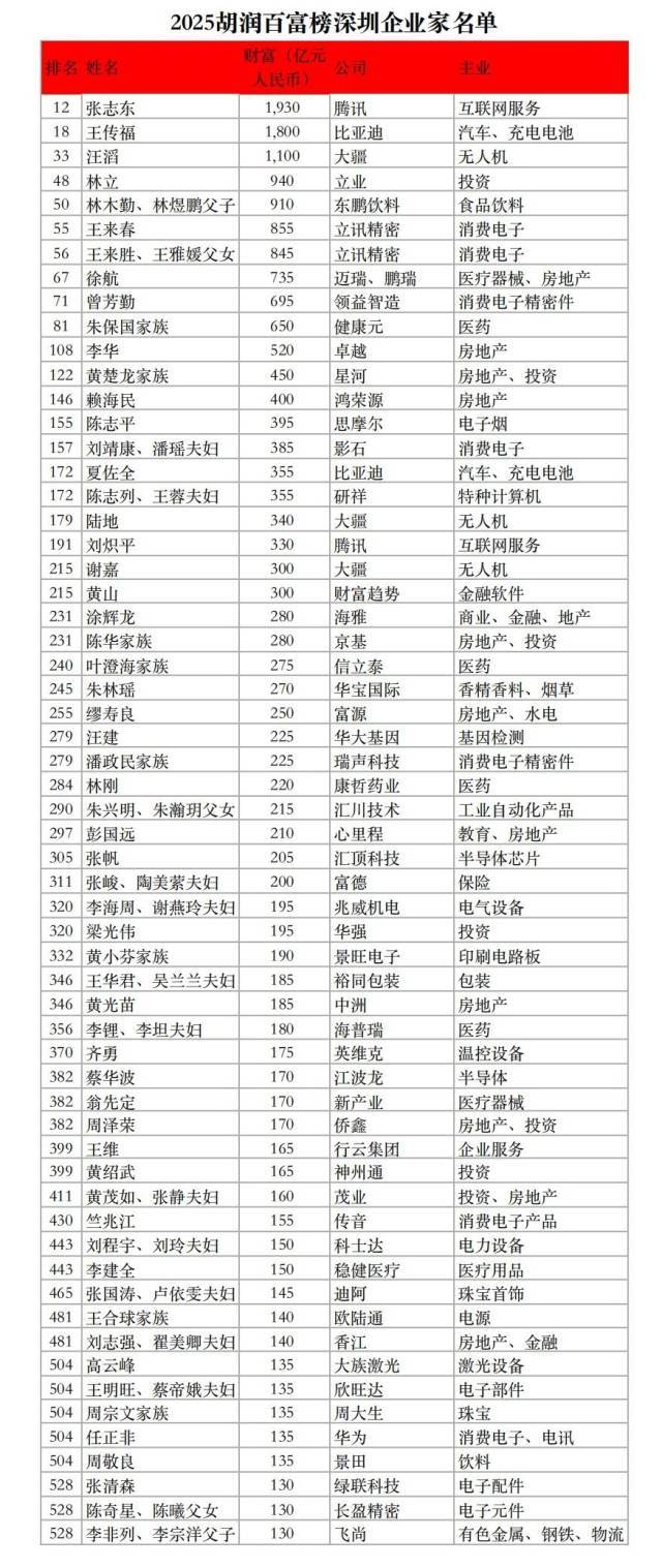 《2025胡润百富榜》10月28日出炉,1434位个人财富50亿元人民币(单位下同)以上的企业家入榜,数量比去年增加31%(340位);总财富接近30万亿元,比去年增长42%(9万亿元)。千亿级企业家增加15位(41位)。深圳企业家数量多年首次超过北京。有意思的是,因为榜单列出的居住地变化,马化腾不在深圳首富,不过依然是大湾区首富。