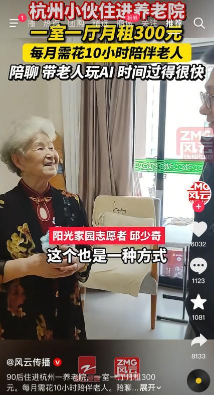 除了直接支付房租外,还有以“志愿者”身份住进养老院的。杭州一家养老院就推出了这项服务,租客每月只要支付300元就能租到一室一厅,而同地段的相同户型普遍在3000元左右,价格相差了10倍。租客需要的,仅仅是每个月花10小时陪伴老人。怎么看,都是双赢的买卖。