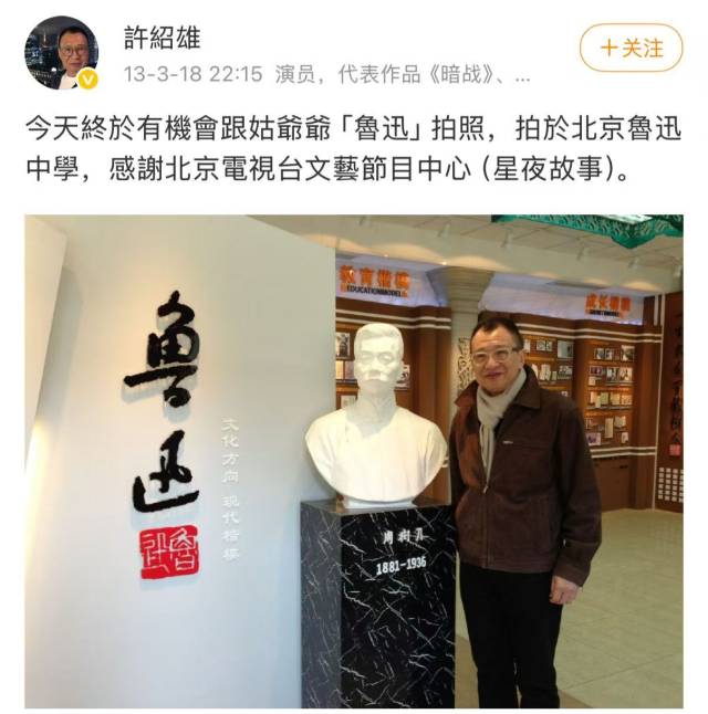 尽管一辈子都在当“绿叶”,许绍雄却是名门之后。许绍雄父亲的姑姑正是鲁迅的夫人许广平,他因此称呼鲁迅为“姑爷爷”。2013年3月18日,许绍雄曾在社交平台上发文:“今天终于有机会跟姑爷爷‘鲁迅’拍照,拍于北京鲁迅中学。”