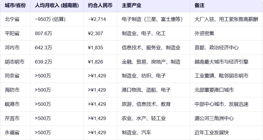 越南2022年主要省市平均工资,人民币和越南盾按1:3500汇率估算