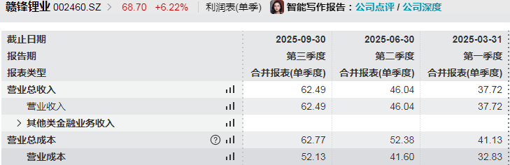 相关数据显示,今年一、二季度,赣锋锂业营收分别为37.7亿元、46亿元,同期营业总成本则分别达到41.1亿元和52.4亿元。